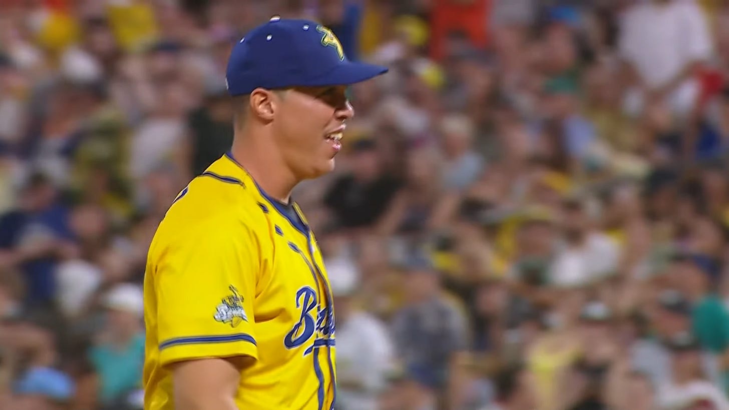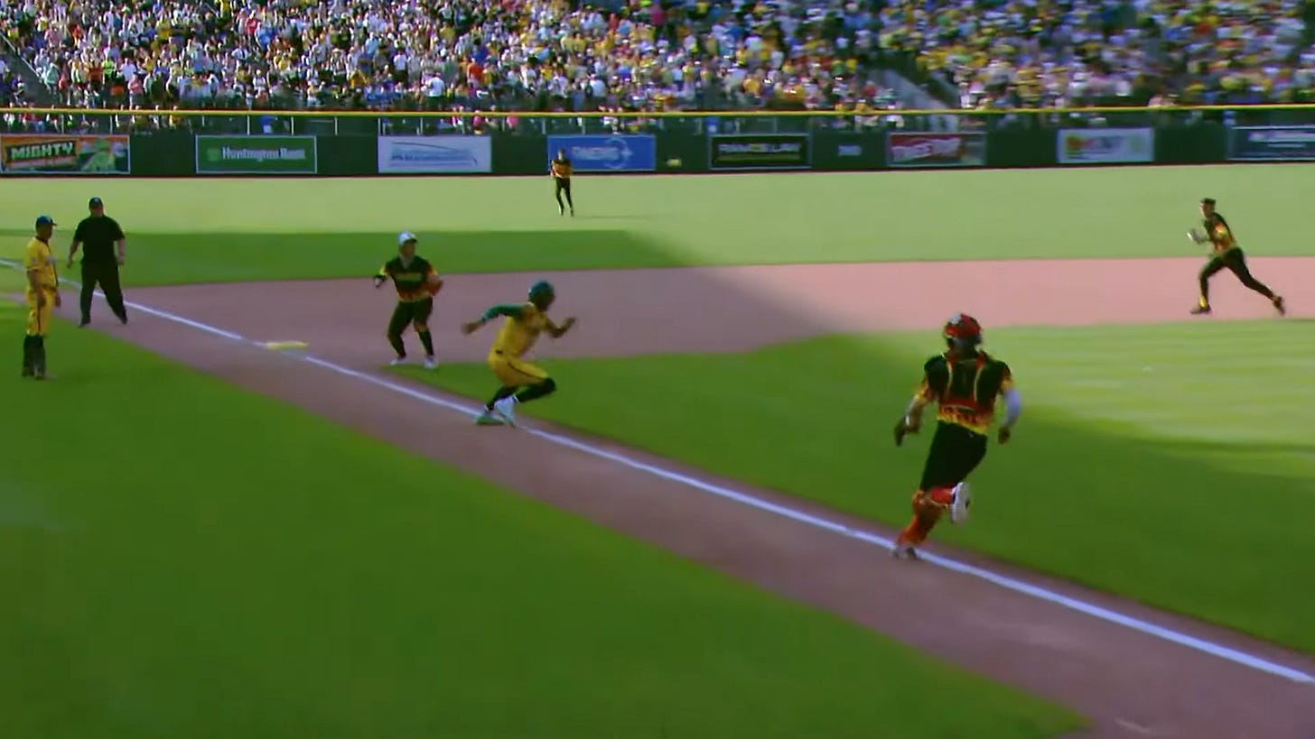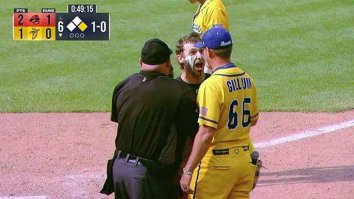 Controversy in the bottom of the sixth with Matt Wolf pitching for The Firefighters. As Wolf was starting to wind up to Jackson Olson with a 1-0 count, Wolf stops, and casually throws to second baseman Caden Green who tags Danny Hosley. Hosley was confused, the broadcast booth was, and probably banana lovers everywhere were also (I know I sure was). It turns out that it was a balk. Honestly, I think this is the first time I have ever seen a balk call in Banana Ball. With the various “stylized” windups and other approaches that Banana Ball pitchers do, it’s hard to determine what is truly a pure “balk”. I am very relieved though that the umps in this sport are not fast to hairline trigger a balk call. This is one of the problems that I have with MLB. Anyway, it was determined a balk and Hosley was awarded second base.