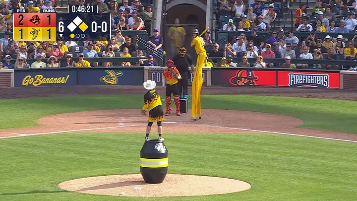 All screenshots: Fans First Entertainment. YT @thepartyanimals.bananaball and YT @thesavannahbananas (fair use).