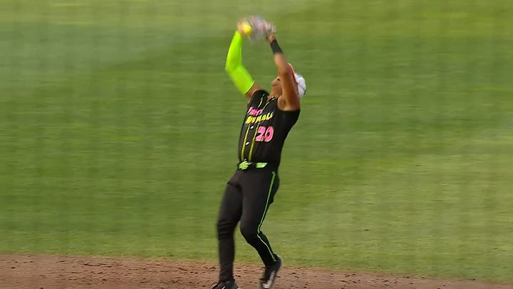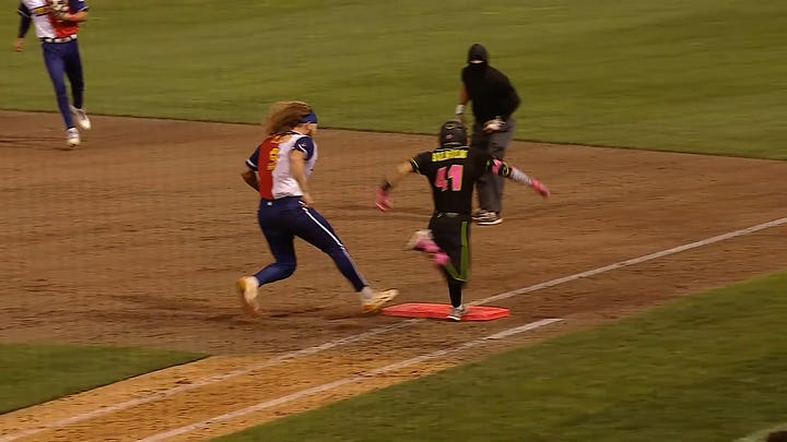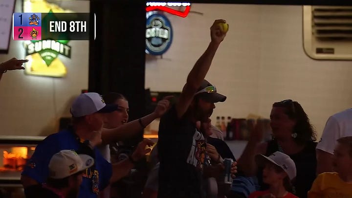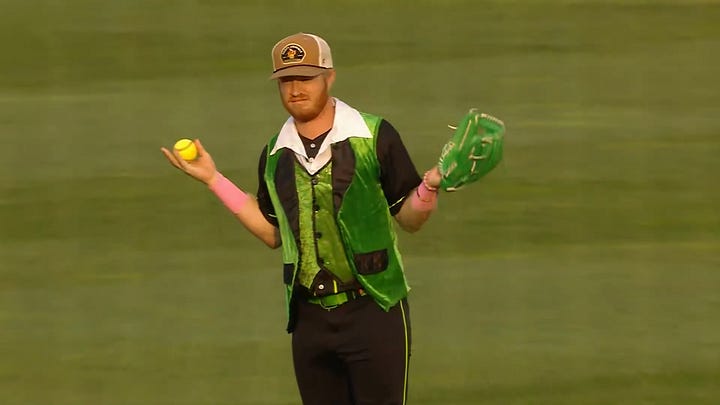 Top of the fourth. Sean Fluke, who came up in the third inning is pitching for the Party Animals and was mic’d up. On a 1-1 count to Indy Stanley, he would fly out to Jake Skole who caught the ball with the outside of his glove. The hot mic also caught something we will not repeat for which Sean was very apologetic for. Bret Carson grounds to Dustin Baber who could not hold on to the ball (Sean has some words here, but they were a bit cleaner). Mac Danford would hit a fly ball to center, Reece Hampton attempted a behind the back catch and was missed. Runners on first and second. With the count at 2-1 to Marcos Castillo, a foul ball was hit right and according to Fluke, the fan caught it in his hat. It was not considered a fan out. Again, why is Banana Ball discouraging trick plays for fan outs? Castillo would then hit it out to the shirtless Tanner Thomas in left field who had some difficulty with the ball. Carson would score easily. Danford had made a diving attempt into home, which was called safe. The Party Animals are challenging the call. The video clearly shows that Danford was able to avoid the tag on his way to home plate. This will mean a 2 RBI double by Castillo. Castillo would be left stranded.