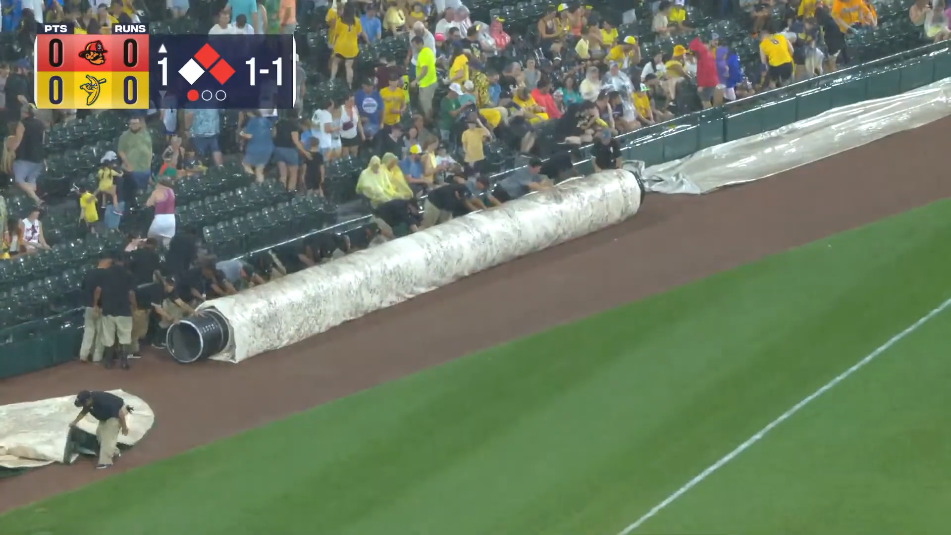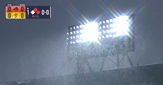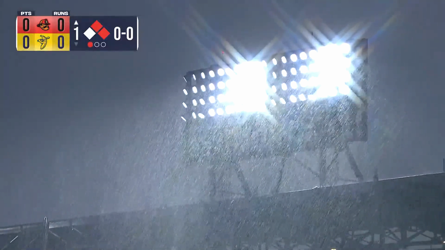 At Rate Field in Chicago, it was already raining as the second game between the Savannah Bananas and The Firefighters was about to start. Jesse Cole was there to start the clock, but a few minutes into the game with one out, runners on first and second and a 1-1 count on Joe Lytle, the grounds crew comes in to roll out the tarp and we go into an 80 minute rain delay. The clock stopped at 1:57:13. The BTV broadcast, which was also being broadcast for the first time on the new TNT Sports deal which included TruTV and HBO MAX would eventually switch to the Party Animals vs. Tailgaters game for the duration of the delay. I know from fan comments, some fans were concerned that the Party Animals were not going to get any TV time with the TruTV deal. While we will see The Party Animals play for at least four games in October during the Championship series, tonight’s temporary addition of the PA on linear TV was an added bonus.