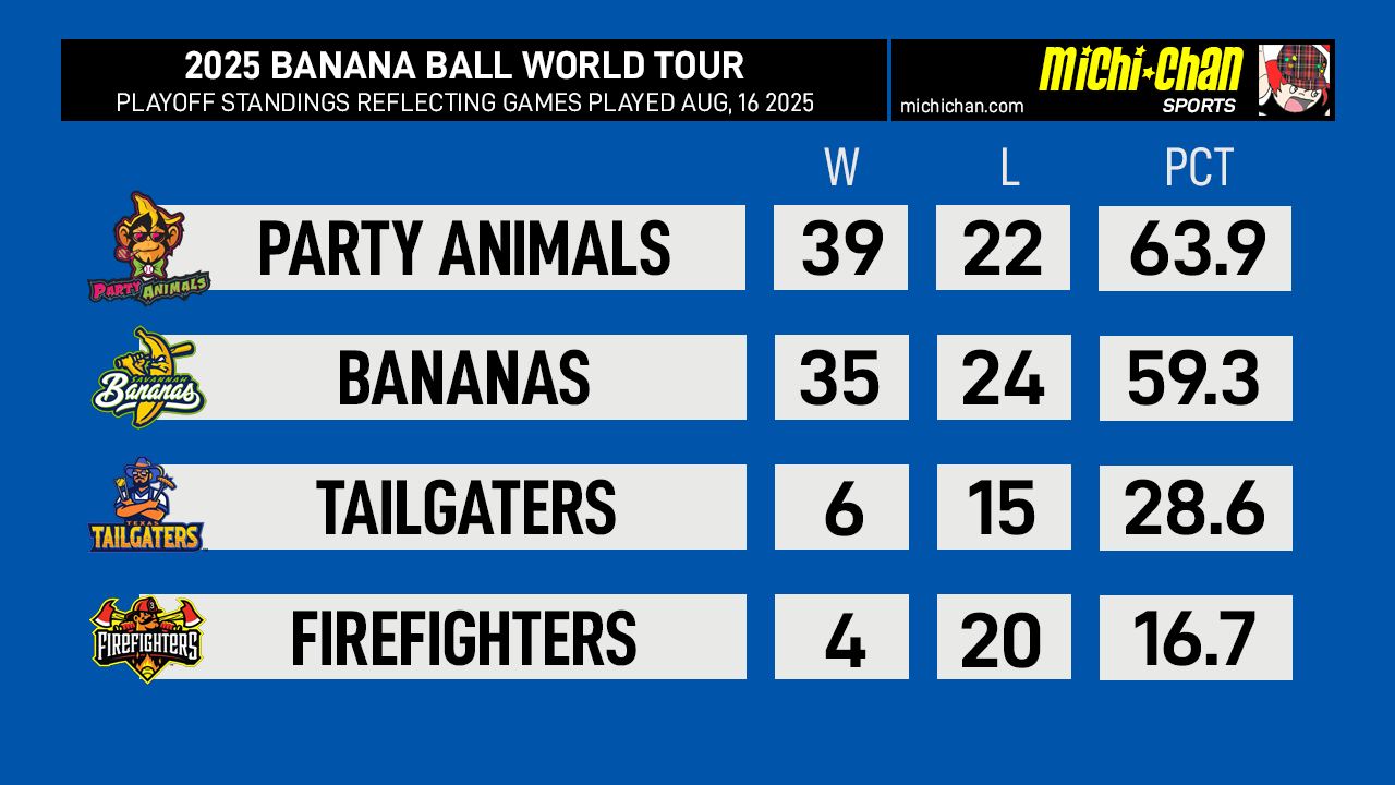Aug 15: Firefighters 2(4)TP9 ~ Bananas 3(4)TP10, Tailgaters 3(9)TP7 ~ Party Animals 4(9)TP9; Aug 16: Firefighters 2(8)TP5 ~ Bananas 5(8)TP14, Tailgaters 0(6)TP2 ~ Party Animals 5(11)TP9.